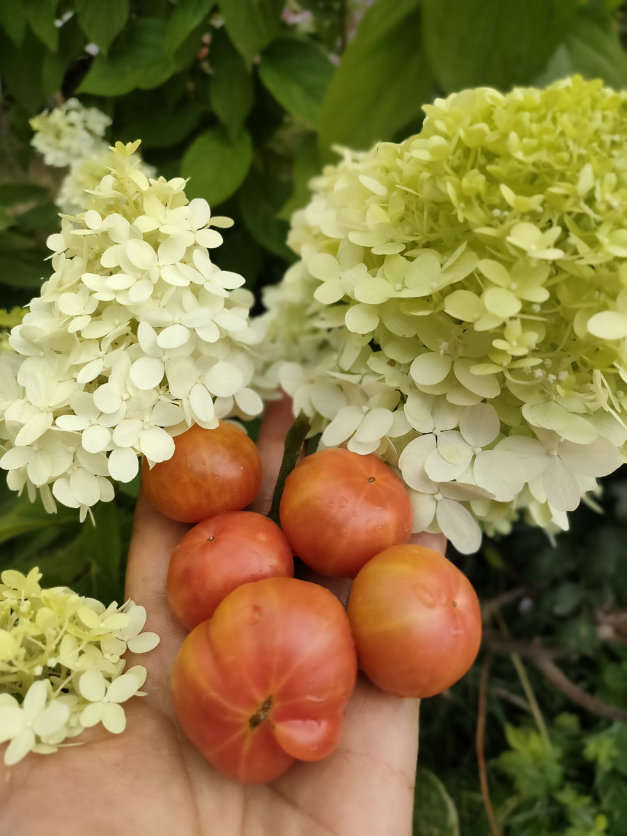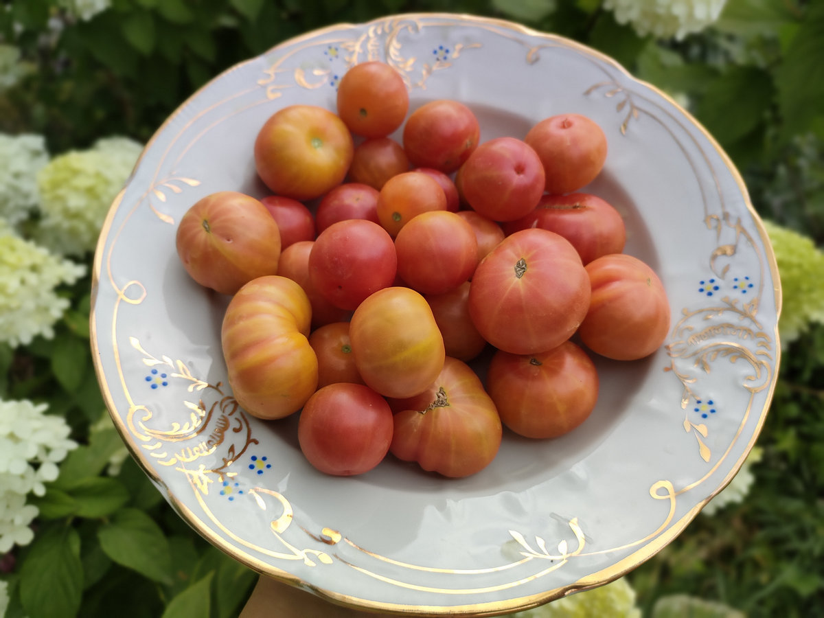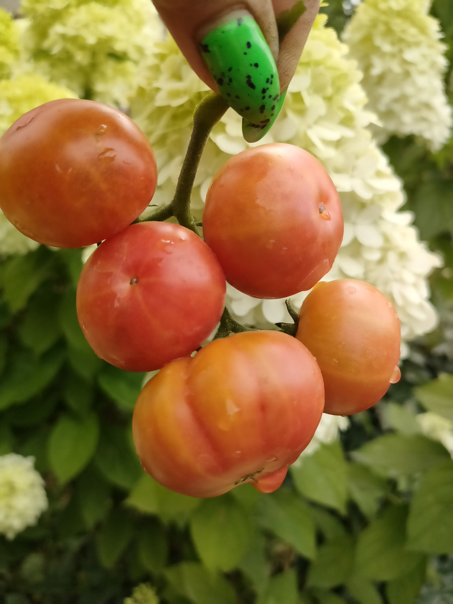 Плоды плоскоокруглые черри, жёлто-оранжевого цвета с розово-красными разводами. Мякоть розово-оранжевая, сочная, очень сладкая.