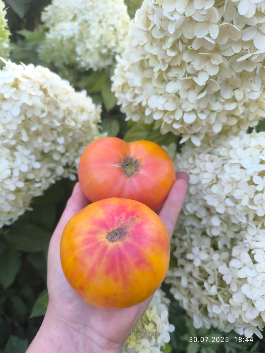 Среднеспелый,детерминантный куст . Плоды плоско-округлые, крупные вес 150-450 г, биколорные (оранжево-желтые с розовым румянцем ).