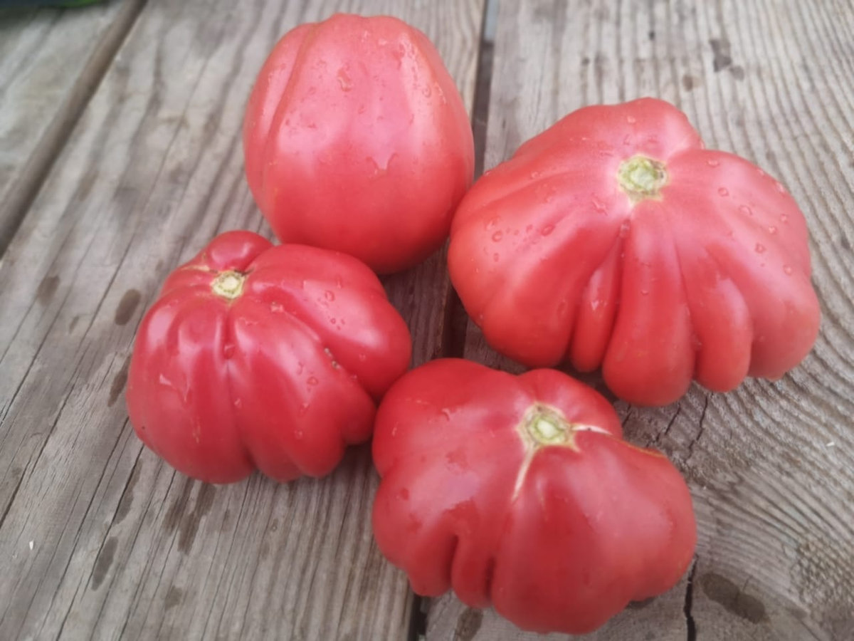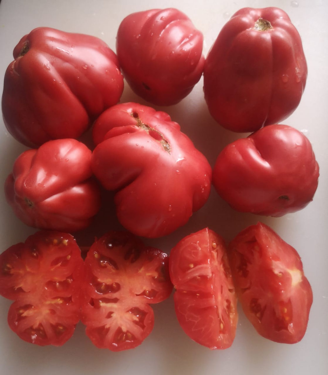 Среднеспелый индетерминантный сорт. Срок созревания 100-105 дней. Томаты плоско-округлые, сильноребристые, по форме напоминающие ягоду инжира. Цвет розовый, сладкий и очень урожайный. Средняя масса томатов 300-800 грамм.