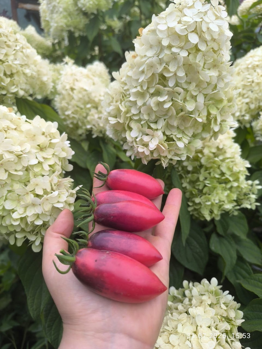 Индет,с красивыми, удлиненными плодами-сливками розового цвета с фиолетово-черным антоциановым напылением и острым носиком. Вес 50-80 г (иногда до 120 г). Он славится сладким вкусом, устойчив к температурным колебаниям и дает обильный урожай до заморозков. Требует подвязки