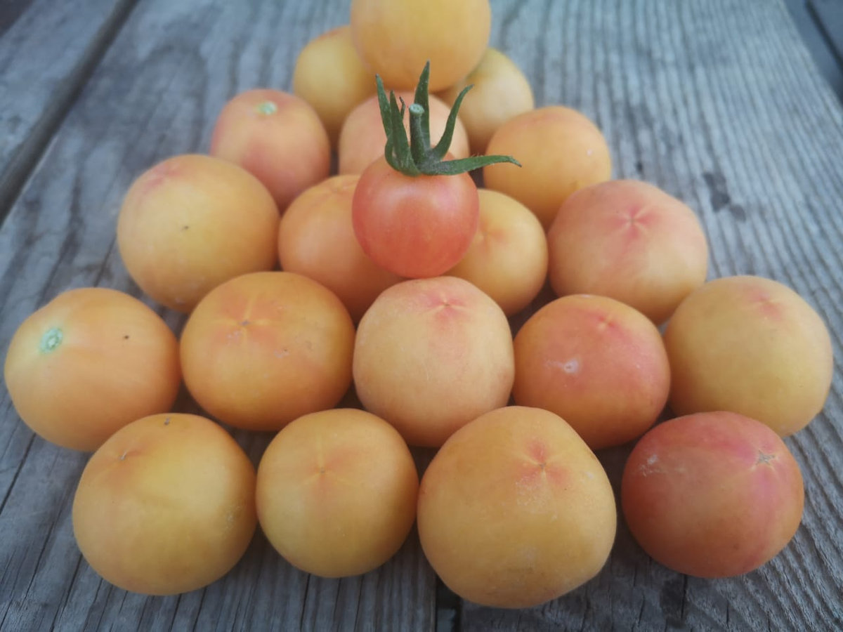 восхищения жёлто-оранжевые с розовым румянцем плоды. Томаты по размеру и форме